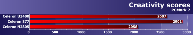 Еще один потенциальный козырь, кстати, пока остался не разыгран — несмотря на то, что PCMark 8 в части тестов умеет использовать OpenCL совершенно официально, в нашем случае, судя по результатам, пока эта поддержка оставляет желать лучшего. Во всяком случае, мы провели тестирование несколько раз с принудительным выбором CPU и GPU для работы с таким кодом — результаты оказались примерно одинаковыми. В случае улучшения совместимости, естественно, улучшатся и показатели. Но не стоит забывать, что только в сравнении с процессорами старых архитектур — Celeron на Ivy Bridge, к примеру, все равно останется далеко впереди, поскольку его GPU тоже умеет исполнять такой код, да и конвееров вычислительных у него просто больше (и их частоты выше).