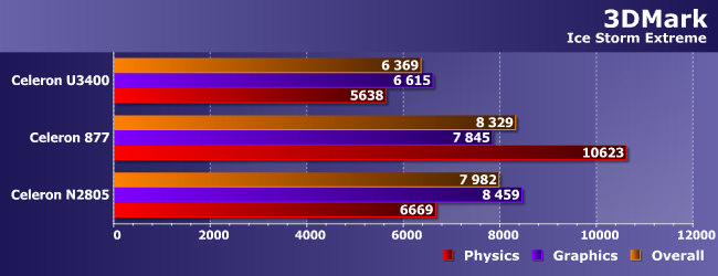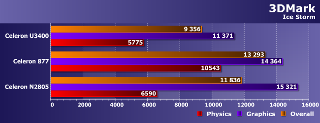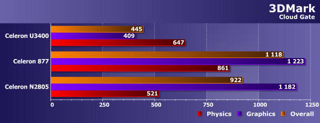 Тест Cloud Gate по замыслу создателей пакета уже худо-бедно пригоден для сравнения друг с другом младших игровых конфигураций компьютеров. Однако его результаты демонстрируют, что таковой считаться не может ни одна из исследуемых систем, что легко понять и из значения среднего FPS — лишь немногим более 5 в лучших случаях. Но тенденции остались прежними — новый Celeron слабее даже очень старого по вычислительным мощностям (что показывает «физический» балл), а вот графика у него неплоха — примерно на уровне Sandy Bridge (за исключением поддержки современных стандартов, но при такой производительности это не важно). Но не лучше. Так что максимум, на что можно рассчитывать — несложные игры. Впрочем, на сложные (что нам хорошо известно) не стоит замахиваться и обладателям ультрамобильных Core i3 на современных ядрах, так что...