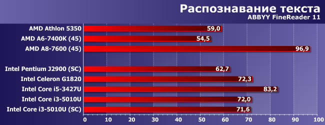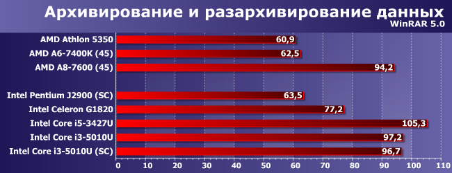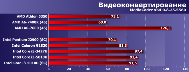 Некоторые фильтры Photoshop активно используют OpenCL, а видеоядро в новом поколении Core в очередной раз улучшилось, и в итоге Core i3-5010U сумел обогнать даже Core i5-3427U и A8-7600. Что ж — Photoshop на ультрабуке вполне возможен :) Заметим, что ослабление системы памяти здесь приводит к драматическому снижению результатов, однако в первую очередь это связано с объемом, а не производительностью: все-таки 4 ГБ для многих фильтров маловато. Но даже в таких (равных) условиях Core i3-5010U обгоняет суррогатные платформы в полтора раза и выходит на уровень «нормально укомплектованных» А4/А6.