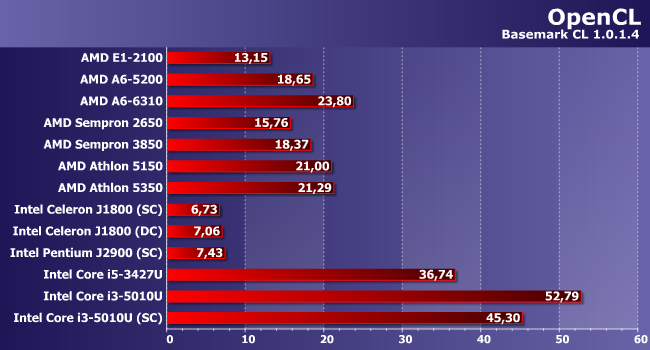 Мы некоторое время назад разбили результаты в этом тесте на две группы — по границе в 25 Вт TDP. Нет ничего удивительного, что в таких условиях Core i3-5010U оказался самым быстрым: единственным полноценным его конкурентом можно считать только Core i5-3427U, но в HDG 4000 вычислительных блоков в полтора раза меньше, чем в HDG 5500, а это важно. Ноутбучные Kaveri, впрочем, будут побыстрее, однако, как видим, для современных процессоров Intel оптимизация приложений под OpenCL уже тоже весьма важна.