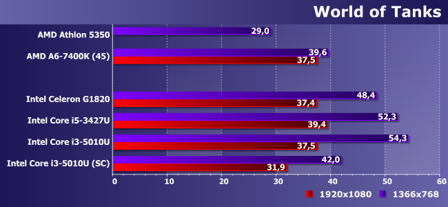 Тот случай, когда процессоры Intel могут легко конкурировать со сравнимыми решениями AMD, и даже не только сравнимыми :) С точки зрения применимости на практике тут интересно, что «танчикам» даже одноканального режима достаточно для FHD (на минималках, разумеется).