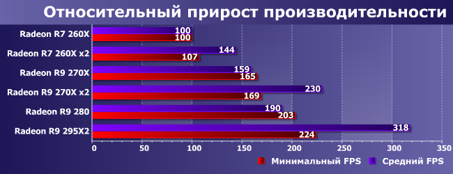 Как видим, игры бывают разными: где-то R7 260X более чем достаточно, а где-то и R9 280 мало. Где-то CrossFire поддерживается хорошо, а где-то от него только хуже. Как бы нам привести все к общему знаменателю? Да очень просто: возьмем среднее геометрическое отношений производительности к Radeon R7 260X. А для более полного раскрытия темы возьмем не только среднюю частоту кадров, но и минимальную, благо в девяти играх из десяти мы фиксируем и ее (хотя и не всегда используем). Режим минимальных настроек, естественно, рассматривать не будем — для него хватает более дешевых решений.