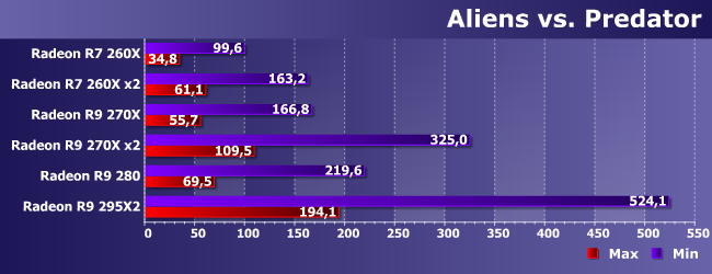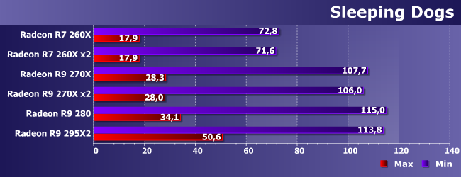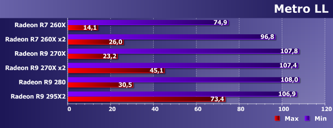 В этой игре даже одиночный R7 260X худо-бедно справляется с максимальными настройками качества, так что «минималки» изучать бессмысленно (несмотря на красивые результаты топовых решений, интересны они лишь в теории). А еще здесь идеально работает CrossFire — производительность практически удваивается. Однако что мы видим? Производительность пары 260Х (за что нужно заплатить порядка 13000 рублей) примерно равна лишь одиночному R9 270Х (стоимостью в районе 10000 рублей) и ниже, чем у R9 280 (около 12000 рублей). Вы все еще хотите использовать multi-GPU? :) Да, разумеется, выдать больше сотни кадров в секунду может только он (даже топовые 290Х, скорее всего, будут лишь на грани), однако столько на практике и не нужно. Для игр такого класса в разрешении Full HD прекрасно подойдет любой Radeon R9, а большее может понадобиться только в специфических случаях.
