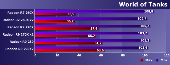 World of Tanks пока вообще не поддерживает CrossFire, но вывод для него аналогичен — младшие Radeon R9 это хорошо, R7 (а 260Х как раз старшая карта этого семейства) — похуже, а топовые решения просто не нужны. Вообще же даже в режиме максимального качества игра сильно зависит от производительности центрального процессора, так что полученные результаты подтверждают еще одну давнюю гипотезу: «процессорозависимость» зависит и от видеорежима. Действительно — на минимальных настройках имеем стабильные 100+ FPS, но для максимального граница лежит где-то в районе 70 кадров в секунду или ниже. Впрочем, достичь ее могут не все видеокарты, но очевидно, что точка перегиба наблюдается где-то в районе R9 280.