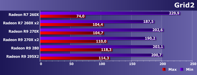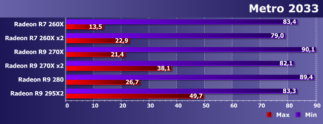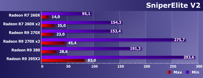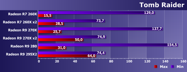Осторожно — зона высоких требований к видеосистеме :) Как видим, минимальным одночиповым решением, пригодным для максимальных настроек, является R9 280 да и то еле-еле. При этом «распараллеливание» практически идеальное, так что даже связка из R9 270X может оказаться оправданной — стоит она сравнимо с одиночной 290Х, но работать будет немного побыстрее. Но лучше, конечно, иметь две таких карты. Можно и на одной плате для удобства — результат внушительный: на максимуме как у R7 260X на минимальных настройках.