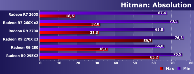 Еще один пример приложения, которому нужно все, но вот процессорозависимость у Hitman выше, чем у серии Metro. Правда... до этого уровня могут «допрыгнуть» не только лишь все, а исключительно мультичиповые решения. Но не обязательно слишком мощные — как видим два 270Х практически идентичны двум 290Х (в виде 295X2). Такое положение дел прямо намекает нам, что при некотором снижении качества картинки, возможно даже и незаметном на глаз, можно добиться хороших результатов и на одиночных 270/270Х. Но не ниже, конечно — там уже качество нужно снижать ощутимо — вплоть до минимума.