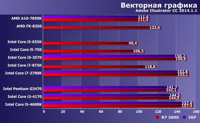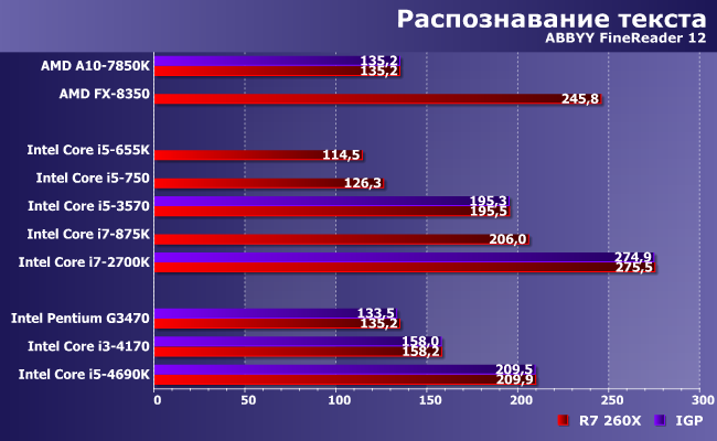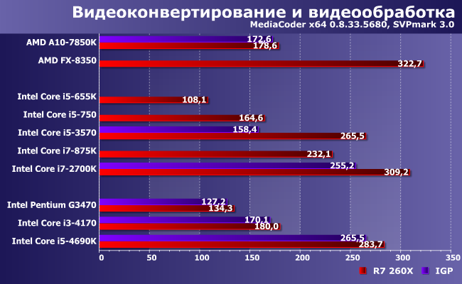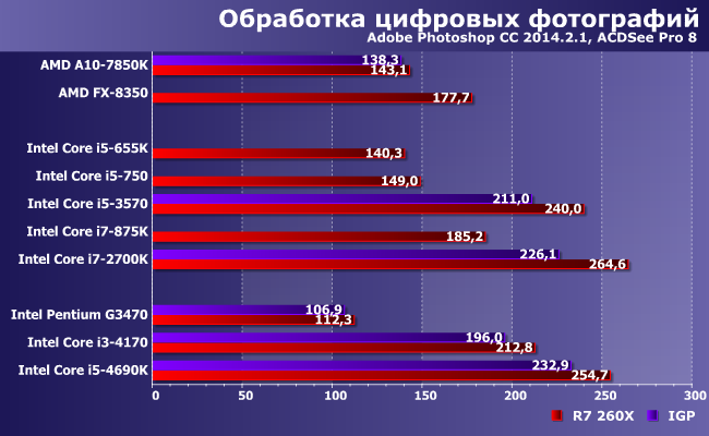 Что касается ориентиров для сравнения, то особого выбора у нас не было: пусть в большинстве тестов (за исключением игровых, естественно) конкретная видеокарта и не имеет существенного значения, но лучше обойтись без приблизительных оценок, когда есть возможность дать точные. Тем более что набор процессоров, протестированных с Radeon R7 260X в прошлый раз, уже достаточно представителен, так что мы взяли по одному современному Pentium, Core i3 и Core i5 и два процессора AMD: AMD A10-7850K и AMD FX-8350.