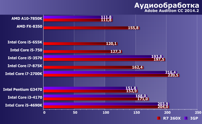 Первые сюрпризы: что А10 здесь примерно равны современным Core i3, мы давно знаем, а вот то, что они спокойно «бодаются» на равных с любыми Core i5 для LGA1156 — это интересно :) Точнее, под «любыми» тут вообще имеет смысл понимать только четырехъядерные модели — двухъядерные Core i5 совсем слабы и уступают даже современным Pentium. Core i7-875K неплох — проигрывает только относительно современным Core i5. Причем последним существенным обновлением их в плане процессорной части имеет смысл считать Ivy Bridge. Но! Иногда графика имеет значение — попытка задействовать «дохлый» HDG 2500 сильно замедляет процессор. Лучше и не пытаться — как на 2700К. И для этих процессоров мы видим уже существенный прирост производительности при использовании дискретного видео: почти 20% для Sandy Bridge и полтора (!) раза для Ivy Bridge с младшими IGP. Вот, собственно, и ответ на вопрос — почему Intel уделяет приоритетное внимание именно доработкам графического ядра: к тому момент, как его использование стало более-менее встречаться в ПО массового назначения, как раз и довели до ума. Для Haswell прирост от дискретки буквально 5%. А вот будь положение дел таким же, как во времена IB/SB — производители дискретной графики сумели бы увеличить свою долю на рынке, убедив и некоторых «не геймеров» в полезности своей продукции. Но благодаря заблаговременной подготовке, этого не произошло.