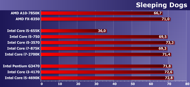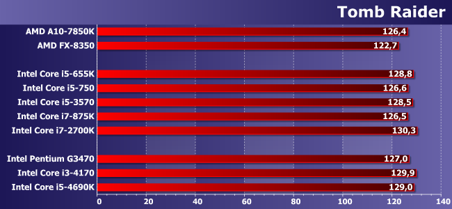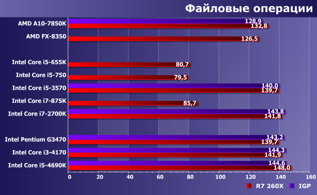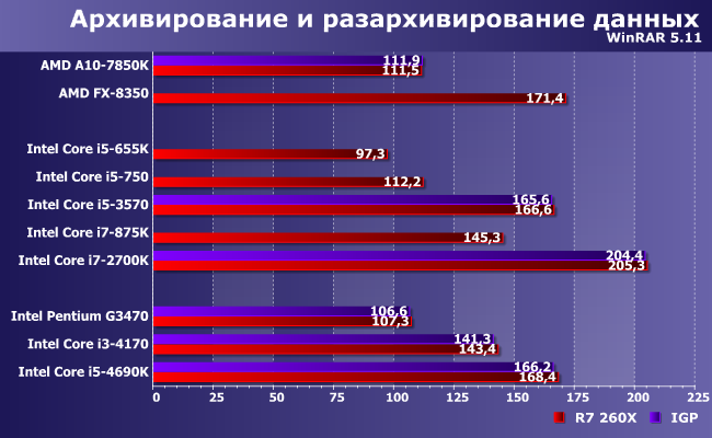 Отметим, что в первом бенчмарке процессоры с интегрированным графическим ядром тестировались два раза: с использованием его и дискретного Radeon R7 260X (кроме Core i5-655K — как уже было сказано выше, его графика не поддерживается используемой нами ОС). А вот игровые тесты проводились только с дискретной видеокартой. Как обычно, для них мы ограничились только режимом минимального качества (для максимальных настроек этой видеокарты самой по себе недостаточно), но в полном разрешении Full HD (с этим-то она, в отличие от многих интегрированных решений, отлично справляется).