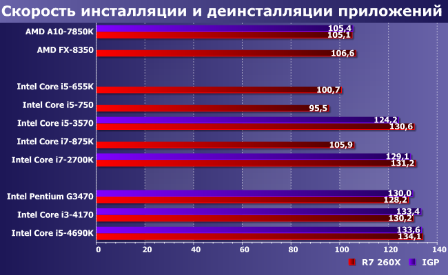 Впрочем, дискретка (что мы уже не в первый раз видим) может и помешать — не хватает тут памяти одному из тестов при работе с восьмипоточными процессорами. Но, что любопытно, в итоге в этом тесте не только FX-8350 выступает на уровне новых Core i3, но и Core i7 первого поколения такие же. А Core i5 еще хуже — даже четырехъядерные. Зато второе поколение Core оказалось переломным: с тех пор заметно увеличить производительность массовых решений так и не удалось, так что LGA1155 продолжает оставаться актуальной. Особенно при использовании дискретной графики...
