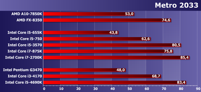 | Процессор | AMD A10-7850K | AMD FX-8350 | Intel Pentium G3470 | Intel Core i3-4170 | Intel Core i5-4690K |