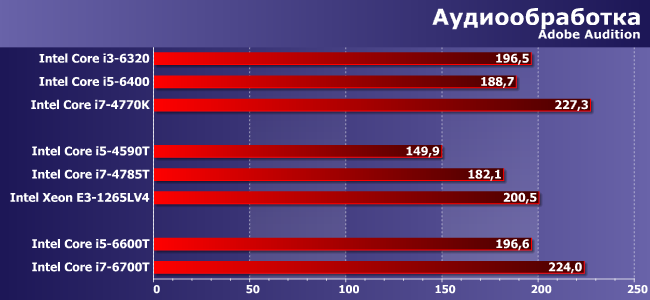 Audition дополнительные потоки задействовать умеет, однако упомянутым процессорам это не слишком помогает. Вот четырехъядерным Skylake позволяет, хотя бы, не уступать двухъядерным высокочастотным собратьям, что неплохо.