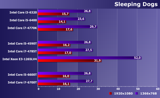 В этой игре Broadwell-GT3e обеспечивает максимальную производительность (напомним, что она ограничена самой игрой) в обоих разрешениях, Skylake-GT2 практически хватает только на сниженное, а Haswell-GT2 — никогда.