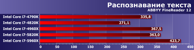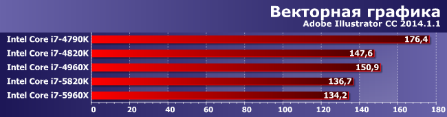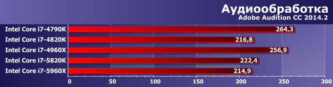 Зато здесь именно увеличение количества ядер является определяющим фактором. И (что характерно) 5820К и 4960Х примерно равны — второй раз уже и снова в условиях, благоприятных для шестиядерных процессоров.