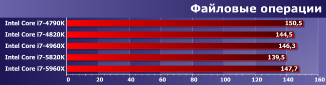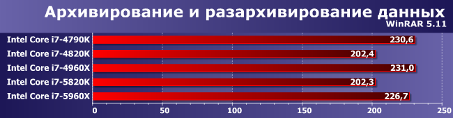 Дополнительные ядра неплохо трудятся при сжатии данных, но вот для распаковки нужно одно максимальной частоты — в итоге и получаем равенство топов для всех трех платформ и отставание от них младших моделей процессоров.
