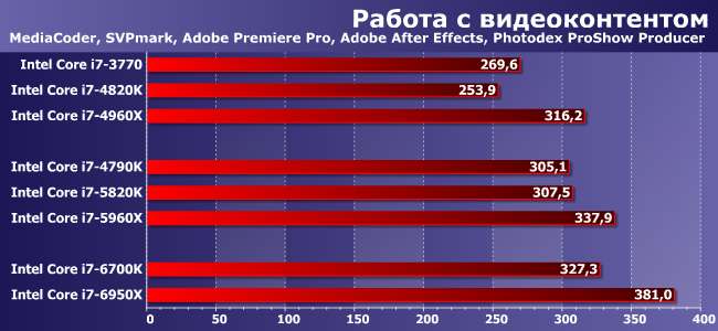 Довольно заметный рывок сравнительно с предыдущим поколением (благо его уже начали «поджимать» модели для массовых платформ), который, вообще-то, мог бы быть и большим. Почему такого не произошло? Виновником опять оказалась одна программа, а именно Adobe After Effects. Ранее в ней наблюдались проблемы при нехватке оперативной памяти при задействовании технологии Multiprocessing, однако в предыдущих версиях программы ее хотя бы можно было включать/выключать вручную. В новой же пользователя такого выбора лишили. Соответственно, программа всегда «выбирает» сама — какие оптимизации использовать в зависимости от наличных аппаратных ресурсов, однако очень часто «ошибается» (так что восстания машин пока можно не бояться :)). Это, впрочем, в подобных случаях немудрено: все-таки доля рынка «истинно многоядерных» систем настолько невелика, что полноценному тестированию ПО в подобном окружении мало кто придает существенное значение (за исключением, понятно, серверных приложений, но и с последними бывают свои нюансы). В итоге скорость решения тестовой задачи на топовых процессорах нередко оказывается более низкой, чем на каком-нибудь Pentium. Проблему наверняка можно решить существенным увеличением количества памяти, что, впрочем, дается не бесплатно, да и исследований на тему, сколько же ОЗУ требуется данной программе и в каких условиях, на просторах сети не наблюдается. Если же следовать более ранним рекомендациям разработчика в виде 2 ГБ на поток вычислений, становится понятно, что и 32 ГБ для десятиядерных процессоров мало. Такая вот особенность топовых решений — для того, чтобы задействовать все возможности последних, очень может быть, что придется платить и за улучшение тех компонентов, которые не сразу приходят на ум. Так что удовольствие это дорогое, даже если вдруг сами процессоры подешевеют.