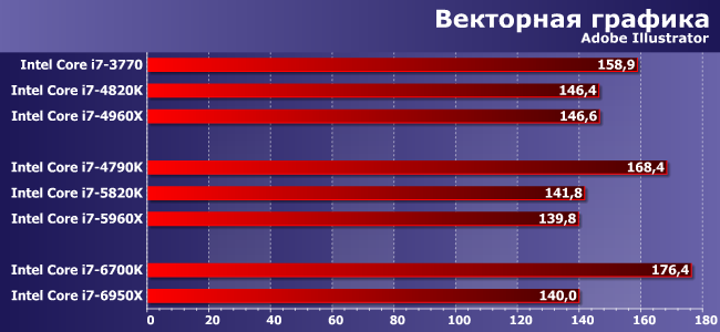 Опять возвращаемся от интерактивного к пакетному режиму работы, причем в «хорошем» его варианте: достаточно старые целочисленные (в основном) алгоритмы с высокой степенью параллелизма однозначно голосуют за многоядерность — настолько однозначно, что здесь Core i7-6700K все еще не может сравняться с шесятиядерными моделями трехлетней давности, хотя четырехъядерники той же архитектуры обгоняет на 20%. Подобное же мы выше видели в Lightroom, т. е. и в прикладных программах массового назначения такое поведение процессоров вовсе не единичный случай. Но и не единственный возможный.