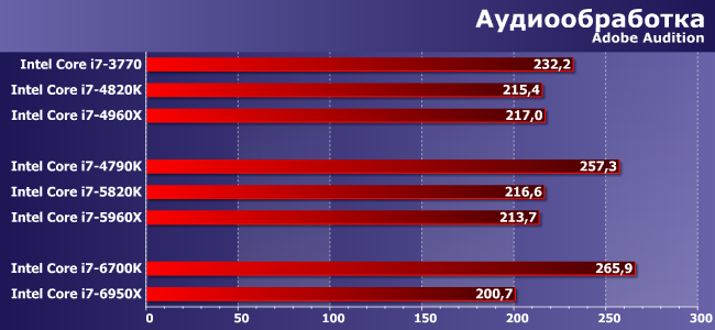 Почти два года назад изучая особенности функционирования массового ПО в зависимости от количества активных ядер процессоров, мы убедились, что на Core i7-5960X максимальная производительность актуальной на тот момент версии Audition достигается... если процессору два из восьми ядер отключить. Судя по всему, особенности оптимизации программы не изменились, так что скорость ее работы на процессорах рассматриваемого сегмента, по сути, даже снижается по мере увеличения их потенциальной мощности. А вот на старших массовых — напротив, растет за счет микроархитектурных изменений и увеличения тактовой частоты. Медленно, конечно, но в итоге можно сказать, что иногда эти семейства процессоров просто идут в разные стороны.