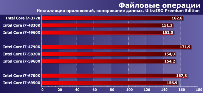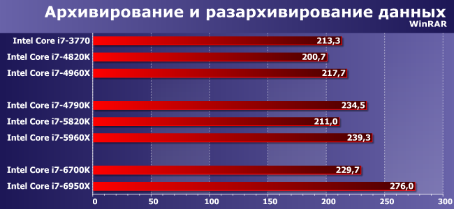 Сжатие данных хорошо распараллеливается, обратный процесс — однопоточный. Благодаря второму современные топовые «квады» в общем итоге легко обгоняют младшие или старые шестиядерные процессоры. Благодаря первому — Core i7-6950X лучший. Хотя и победа не столь уж убедительна — менее 25% при большем в 2,5 раза количестве ядер. Но, в общем, понятно, что для тех, кто ежедневно архивирует сотни гигабайт информации — выбора нет. Встретите таких — познакомьте ;)