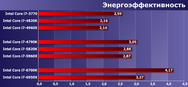 Формально платформы LGA2011 всех модификаций считаются «очень горячими», на что прямо намекают и требования производителя к системам охлаждения — для сохранения гарантийных обязательств Intel от процессора требуется уметь отводить 140 Вт тепла. Однако по сути такие цифры продиктованы не необходимостью, а, скорее, так уж оно сложилось. Все равно никто не будет запихивать топовую платформу в тесный корпус и устанавливать вентилятор за 20 долларов (хотя такие, кстати, в свое время поставлялись в комплекте со многими многоядерными процессорами, но т. н. «энтузиасты» их все равно с презрением игнорировали). В действительности же, как видим, энергопотребление таких решений может считаться высоким лишь сравнительно с массовыми платформами того же времени и того же производителя — борьба за энергоэффективность отражается и на них. В итоге и получаем, что даже топовые решения для LGA2011-3 энергии потребляют на уровне некогда массовой LGA1155. Да и добавление количества ядер обычно хорошо согласовано с улучшения техпроцессов, например — поэтому 6950Х не стал более прожорливым, чем был 5960Х.