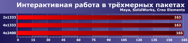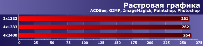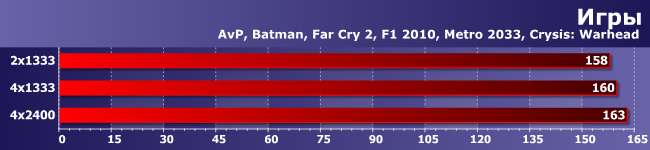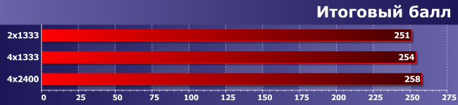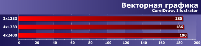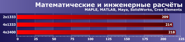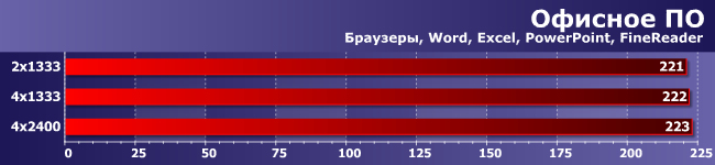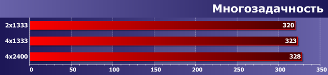Многопоточность здесь «врожденная», а не внешняя, как в предыдущей группе, но очень важны и задержки. Однако в конечном итоге, как видите, увеличение числа каналов памяти дает эффект, аналогичный приросту частоты. Казалось бы, чистая победа… Но слишком уж омраченная тем, что прирост, вообще говоря, копеечный: даже между 2×1333 и 4×2400 не набралось и 5% разницы.