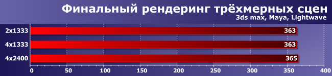 Как и рендеринг, это задача на чистую математику. Правда, одновременная работа 12 потоков вычислений приводит к тому, что что какая-никакая разница между двух- и четырехканальным режимами есть, а вот частота значения не имеет — пропускной способности даже DDR3-1333 достаточно, задержки в потоковом режиме минимальны.