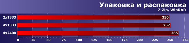 Эта группа программ нами уже изучалась подробно, так что с ней было все ясно априори: к характеристикам системы памяти архиваторы требовательны, но на повышение частоты реагируют всегда (пусть и слабо — после достижения определенного уровня), а вот увеличение канальности может пригодиться лишь при многопоточной работе. Если для архивации это условие уже худо-бедно выполняется (в частности, за прошедшее с момента ввода тестовой методики в эксплуатацию время и WinRar стал действительно много-, а не двухпоточным), то куда более частая обратная операция массовыми программами почти всегда выполняется всего в один поток. Ну а если использовать в тестах обе операции (что мы и делаем), то общий результат оказывается закономерным.