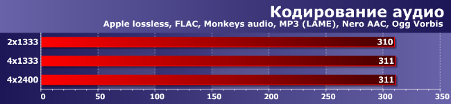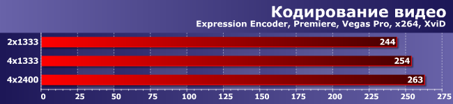 А вот эти приложения восприимчивы и к пропускной способности памяти, что немудрено: все-таки обработка видео предполагает работу с большим количеством данных. С другой стороны, процессоры такого класса справляются с нашими тестовыми заданиями легко, так что реальная разница между конфигурациями исчисляется в секундах.