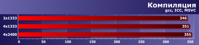 Казалось бы — серьезная многопоточная нагрузка с числом активных потоков, превышающим аппаратные возможности процессора, причем в число активных задач входят и компиляция, и упаковка 7-Zip, которые и по одиночке очень требовательны к системе памяти. Однако… В очередной раз получаем все тот же результат: производительность меняется, но крайне незначительно. То есть как ни крути, как ни подгоняй условия, а «узкое место» обычно вовсе не в системе памяти. Улучшение характеристик последней, безусловно, нередко сказывается на производительности, однако, как видно, даже при атипичной для среднестатистического настольного компьютера нагрузке величина эффекта составляет 1-2%.