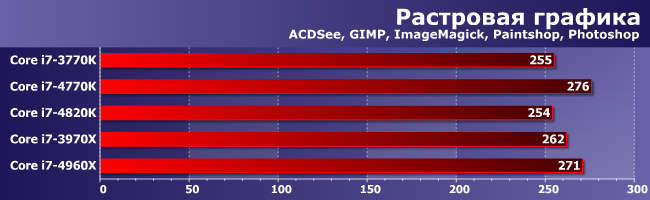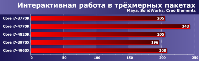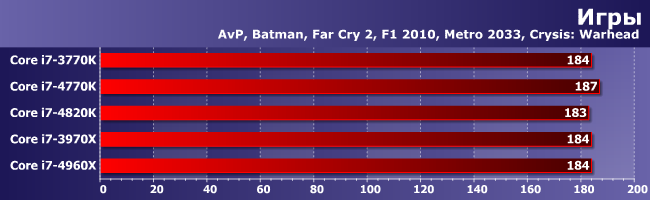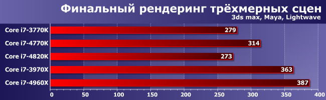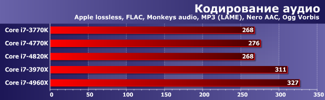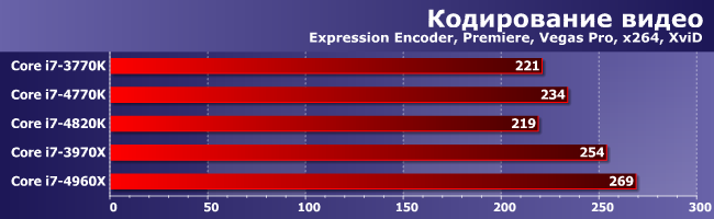 Пожалуй, лучший результат 4960Х — он обошел 3970Х на все 10%. Впрочем, часть из них стоит зачесть памяти: на увеличение ее частоты в этой группе приложений 3970Х реагировал относительно неплохо. А вот 4820К большие размер L3 и частота ОЗУ плюс его четырехканальность (которая, как мы знаем, здесь имеет преимущество в производительности) в совокупности позволили разве что не отстать от 3770К, появившегося на рынке еще прошлым летом. Этого можно было ожидать, конечно, но некоторые, возможно, надеялись на то, что данный процессор можно считать хоть в какой-то степени конкурентом 4770К. Зря надеялись.