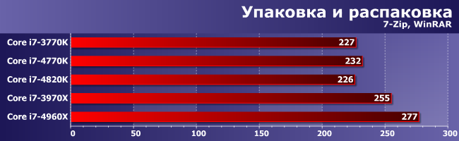 Шестиядерные модели усилили свое превосходство — кэш-памяти в них много, да и упаковка в 7-Zip многопоточная. Ну и использование DDR3-1866 что-то тут дало 4960Х при сравнении его с 3970Х. А вот 4820К опять отстал от 3770К, несмотря на «лишние» 2 МБ L3 и большую частоту памяти — это все более и более укрепляет нас в мысли о недостатках четырехканального контроллера процессоров для LGA2011.