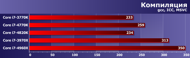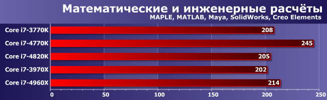 Все наглядно — новые процессоры для LGA2011 сумели выйти на уровень топов для LGA1155, поскольку более не отстают от них архитектурно, но никакого сравнения с Haswell не выдерживают. Как и ожидалось — по сути эти нагрузки являются однопоточными, частоты всех участников практически одинаковы (плюс-минус 100 МГц) так что все решает архитектура.