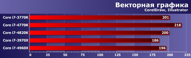 Как мы уже говорили не раз, эти приложения до сих пор являются фактически двухпоточными, поскольку более-менее хорошо оптимизированы еще под старенькие Core 2 Duo. В результате шестиядерные монстры с огромным объемом кэш-памяти в них вообще проваливаются относительно аналогичных архитектурно процессоров «массовых» линеек. Впрочем, 4960Х быстрее, чем 3970Х, но это и ожидалось. И, как обычно, он лишь немногим быстрее. Так что LGA2011 вообще не лучшая платформа для активно работающего с CorelDraw, например, дизайнера.