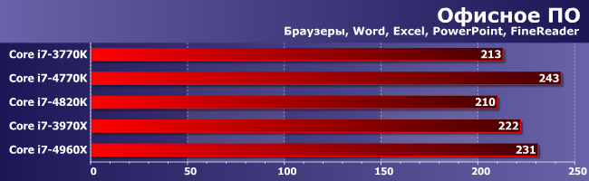 За счет наличия в группе FineReader, шестиядерники в ней могут показать что-то более-менее приличное, однако большое количество однопоточных подтестов все равно выводит на первый план архитектуру. Впрочем, очевидно, что для такого применения все перечисленные процессоры попросту избыточны.