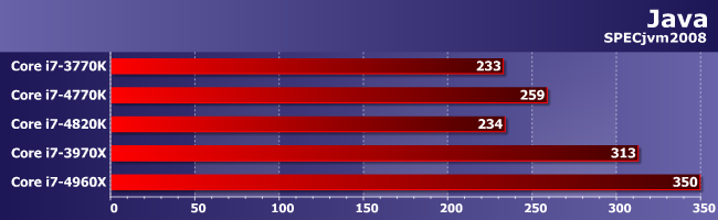 Чего не скажешь про JVM, которая, как мы знаем, очень любит что четырехканальную память, что большое количество ядер. Но и к микроархитектурным различиям восприимчива, так что все, что сделал 4960Х — восстановил статус-кво, нарушенный появлением Haswell. А 4820К, естественно, ни на какие подвиги не способен.