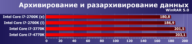 Эта программа поддерживает GPGPU, но, как видим, «ускорительные» способности Radeon HD 6450 слишком малы, чтобы серьезно принимать их во внимание. Пожалуй что и к IGP более новых семейств Intel это тоже относится, так что в случае старших настольных моделей Core i7 данный тест можно относить к «процессорным». И хорошо демонстрирующий разницу между поколениям процессорных ядер — ≈+10% на каждом шаге. Что неплохо для перехода от Sandy Bridge к Ivy Bridge (напомним — происходившим без смены платформы), но, разумеется, маловато для широко разрекламированного обновления архитектуры в виде Haswell.