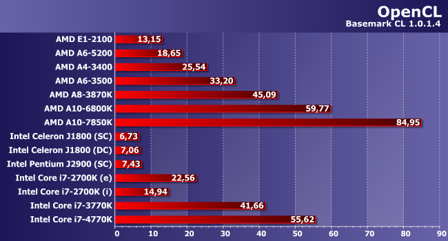 А вот, пожалуй, объяснение — почему даже поддержка OpenCL не вытянула пару из i7-2700K и Radeon HD 6450: этот процессор даже в программном режиме способен интерпретировать такой код всего в полтора раза медленнее указанной видеокарты. Медленнее. Но в полтора раза причем в бенчмарке. Так что использование GPGPU не позволяет ничего ускорить в конечном итоге, поскольку весь выигрыш оказывается «съеден» необходимостью в пересылке данных и т.п. А GPU Core i7-3770K уже вдвое быстрее, чем Radeon HD 6450 и выходит на уровень старых AMD A8. HDG 4600 же в свою очередь способен конкурировать уже и со старыми А10. В общем, вот тут-то прогресс хорошо заметен.
