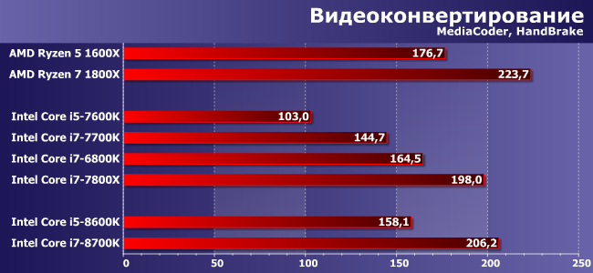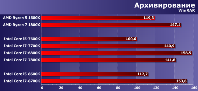 Есть ощущение, что разок «сыграл» четырехканальный контроллер памяти — во всяком случае, чем-либо иным такой успех i7-6800K объяснить сложно. Но i7-8700K отстает от него незначительно, а вот сам опережает Ryzen 7 1800X, замыкающий тройку лидеров, довольно заметно. У этой программы, возможно, есть резерв для улучшения работы с новыми процессорами, что позволит i7-7800Х и Ryzen демонстрировать более высокий результат. Впрочем, и так положение дел с архивированием благоприятно для новичков, хотя своих непосредственных предшественников они не слишком обгоняют.