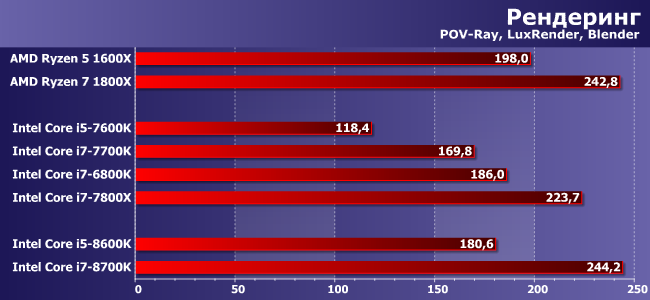 Восемь ядер — это, конечно, восемь, но новые шестиядерники Intel не слишком-то и отстают от Ryzen 7 1800X, а стоят дешевле. Особенно хорош, естественно, i7-8700K, который работает даже немного быстрее, чем 7800Х. В принципе, и i5-8600K нас не разочаровал: он с легкостью обошел Core i7-7700K. Правда, от Ryzen 5 1600X он все-таки отстает, но это уже не тот разгром, который наблюдался в случае i5-7600K. Кстати, стоит обратить внимание на то, что преимущество над предшественником более чем полуторакратное, т. е. речь идет не только о дополнительной паре ядер. Да и Core i7 тоже «отмасштабировался» практически линейно.