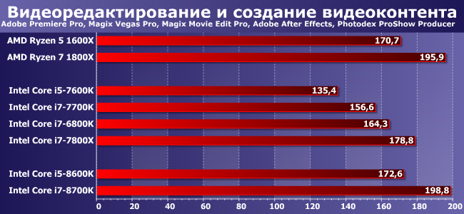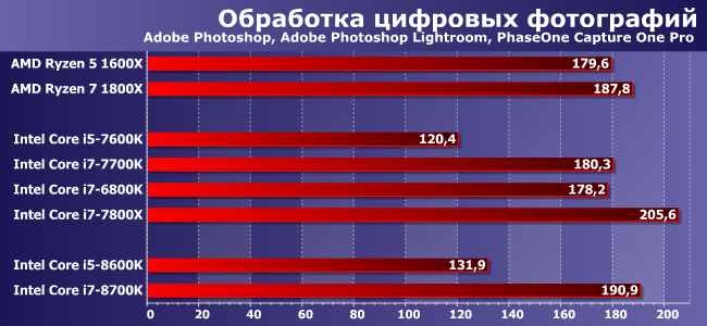 Photoshop продолжает чудить: программе явно не нравится не только отсутствие Hyper-Threading, поскольку производительность Core i5-8600K здесь лишь на уровне i5-7400, даже не 7600К. Остальные две программы в группе «подтягивают» новичка повыше, но все равно мы получаем прекрасную иллюстрацию того, как программные проблемы могут испортить все, что угодно. А вот у Core i7-8700K таких проблем нет, так что в общем зачете он уступил только i7-7800X.