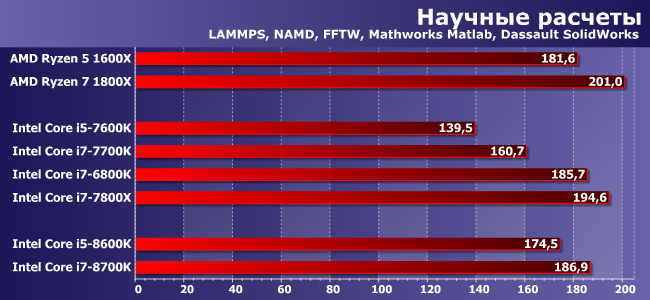 И пара моделей AMD. Ryzen 5 1600X при использовании дискретной видеокарты был непосредственным конкурентом Core i5-7600K, а теперь должен сражаться с i5-8600K. Ryzen 7 1800X, строго говоря, непосредственно ни с кем не пересекается. Но младший Ryzen 7 1700 к нам в руки, к сожалению, так и не попал, так что достаточно оценить концы диапазона — и он, и 1700Х по производительности должны быть как раз где-то между 1600Х и 1800Х. 1700Х, кстати, как мы знаем, по производительности вообще практически не отличается от 1800Х, но потребляет больше энергии — так что неспроста стоит дешевле. В общем, можно считать, что мы дали небольшую фору AMD, взяв Ryzen 7 1800X, а также тестируя оба процессора с немного разогнанной памятью — DDR4-2933 вместо штатных 2667 МГц.