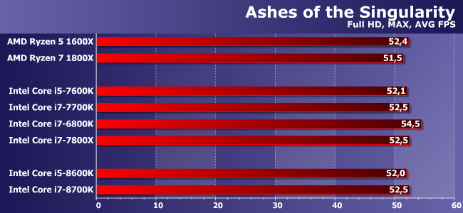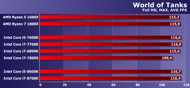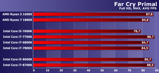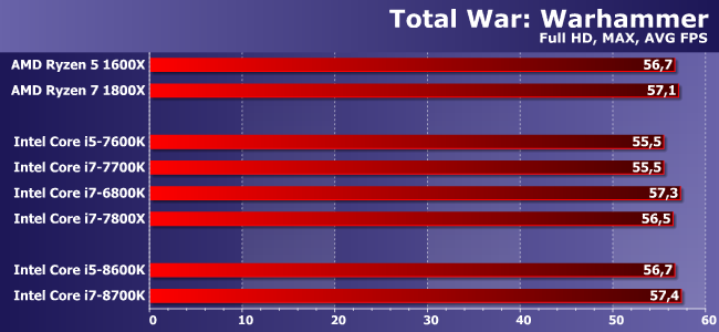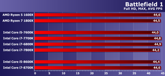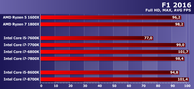 Расклад почти повторяется, только здесь уже Core i7-8700K не отстал и от 1800Х. Отличный результат в верхнем сегменте! И похуже — в среднем: Ryzen 5 1600X продолжает оставаться привлекательным при использовании дискретной видеокарты. С другой стороны, можно рассчитывать на то, что после появления недорогих плат какой-нибудь Core i5-8400 отлично подойдет тому, кому быстрая графика не нужна — ему-то, по сути, вообще не с кем будет конкурировать в таком раскладе :)
