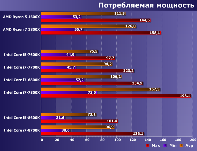 Впрочем, производительность и цена — не единственные характеристики процессора, а в плане энергопотребления Core i5-8600K как раз смотрится отлично: он практически идентичен предшественнику. Энергопотребление же Core i7-8700K несколько выше, чем хотелось бы.