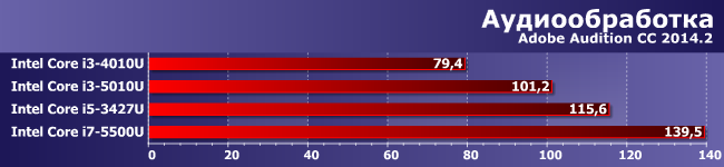 Пропустив обработку фотографий без отдельного комментария (он может быть только таким же, как к первым двум диаграммам), переходим к непохожему на предыдущие случаю. Но вполне объяснимому — здесь «играет» только процессор, да и нагрузка является по сути своей однопоточной. Соответственно, все модели демонстрируют производительность, пропорциональную максимальной частоте одного ядра — тут Core i3 без Turbo Boost приходится несладко, да и новый Core i7-5500U выглядит не слишком убедительно, поскольку 2,8 ГГц Core i5-3427U были почти максимумом в семействе и слишком близки к 3 ГГц новичка. Что ж — и такое бывает.