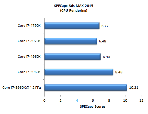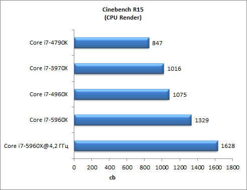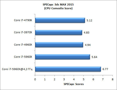 Процессор Intel Core i7-5960X тестировался в штатном режиме и в разгоне до частоты 4,2 ГГц, а все остальные процессоры тестировались только в штатном режиме.