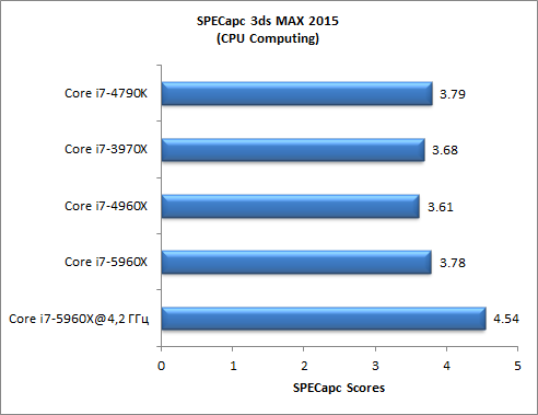Начнем с теста SPECapc 3ds Max 2015. В этом тесте по интегральному показателю (CPU Composite Score) лидером оказался восьмиядерный процессор Core i7-5960X, который в штатном режиме работы превосходит процессор Core i7-4790K на 10%. Причем если по скорости расчета (CPU Computing) все процессоры демонстрируют схожие результаты, то по скорости рендеринга (CPU Rendering) Core i7-5960X превосходит всех остальных. Интересно отметить, что четырехъядерный процессор Core i7-4790K в этом тесте по интегральному показателю (CPU Composite Score) обгоняет шестиядерные процессоры Core i7-3970X и Core i7-4960X.