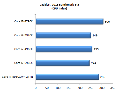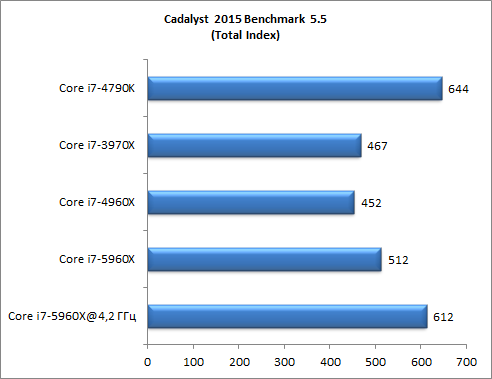 Тест Cadalyst 2015 для пакета Autodesk AutoCAD 2015 продемонстрировал довольно неоднозначные результаты и не смог выявить преимущество восьмиядерного Core i7-5960X. И по интегральной оценке (Total Index), и по оценке производительности процессора (CPU Index) лидером в этом тесте оказался четырехъядерный Core i7-4790K, который превзошел даже разогнанный Core i7-5960X.