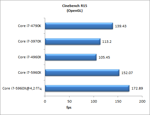 А вот с подтестом OpenGL теста Cinebench R15 все не столь однозначно. Этот подтест направлен на измерение производительности графической карты, однако его результаты зависят, в том числе, и от производительности процессора. И это наглядно видно по результатам тестирования Core i7-5960X: результат возрастает при увеличении тактовой частоты. Однако не очень понятно, почему в данном подтесте результаты процессоров Core i7-3970X и Core i7-4960X оказываются хуже, чем у процессора Core i7-4790K.