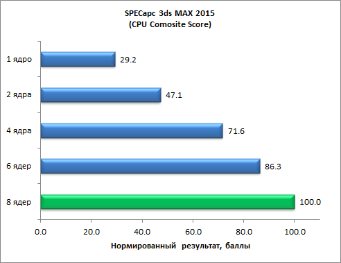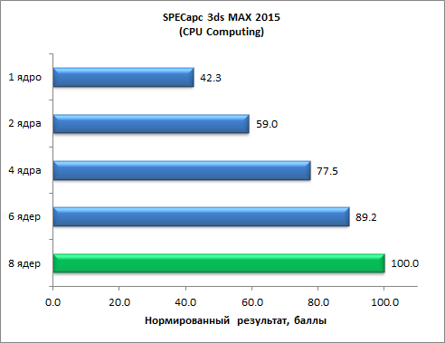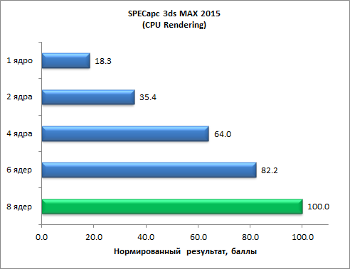 В тесте SPECapc для приложения Autodesk 3ds Max 2015 результаты демонстрируют неплохую масштабируемость по числу ядер процессора. Причем такая масштабируемость наблюдается не только в интегральном результате (CPU Composite Score), но и в расчетной части (CPU Comuting), и в процессорном рендеринге трехмерных сцен (CPU Rendering).