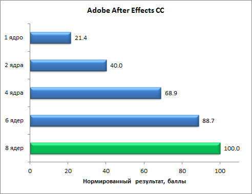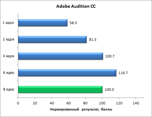 В тесте на основе приложения Adobe Audition CC результат получился довольно интересным. При увеличении числа ядер процессора от одного до шести результат возрастает. А вот переход от шести к восьми ядрам процессора приводит к ухудшению результата. В итоге, результат для конфигурации с четырьмя ядрами не отличается от результата для конфигурации с восемью ядрами.